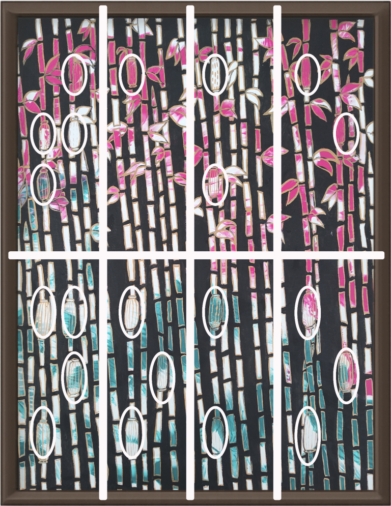 Within each section, the presence or absence of a lantern begins to form a pattern. These patterns correspond to characters from a tactile writing system.